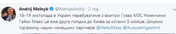 "18-19 ноября в Украине будет находиться с визитом глава МИД Германии Хайко Маас: это уже вторая поездка в Киев за последние 5 месяцев. Ценим поддержку наших немецких партнеров", - сообщил он.