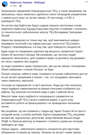 Поэтому на своей странице в Facebook "Нафтогаз" разместил объявление о том, что они приглашают работников Новороздольской ТЭЦ, а также работников, уволившихся из-за невыплаты заработной платы на встречу в понедельник, 18 ноября, в 9:00.