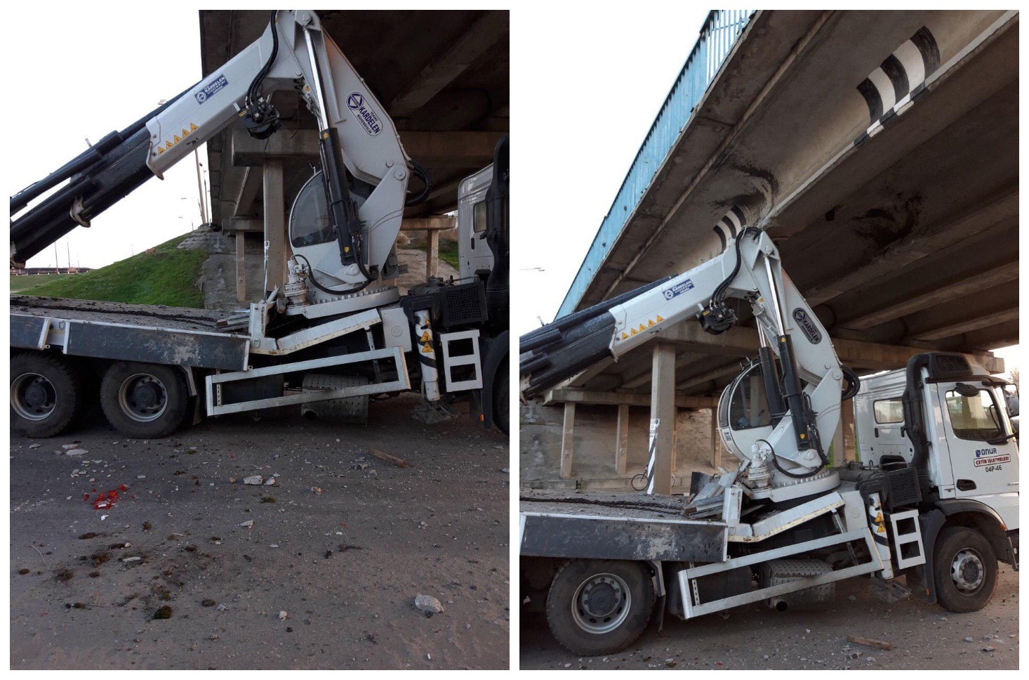 Вероятнее всего, кран врезался в мост из-за того, что был частично с выдвинутой стрелой. В результате этого транспорт согнулся, а на мосту появилась трещина.