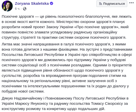 "На встрече с представителями Посольства Литовской Республики в Украине ... мы договорились о поддержке Украины в построении системы социализации лиц с психическими расстройствами. Одними из приоритетов является повышение уровня осведомленности относительно психического здоровья в обществе, разработка и внедрение программ преодоления стигмы на национальном и региональном уровне, активное привлечение лиц с психическими и интеллектуальными нарушениями и их семей к диалогу в построении новой системы" - написала министр.