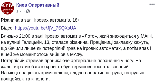 В Киеве на улице Галицкой в зале игровых автоматов произошла драка с использованием холодного оружия. Одного из мужчин подрезали. Об этом сообщает "Киев Оперативный".