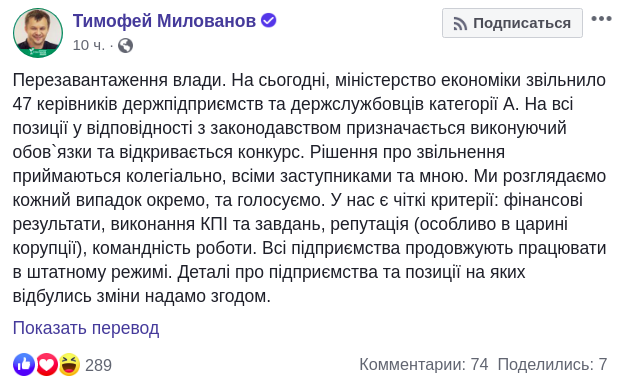Министр развития экономики, торговли и сельского хозяйства Тимофей Милованов сказал, что полсотни руководителей подконтрольных его ведомству госпредприятий уволены. Об этом он сообщил в Facebook.
