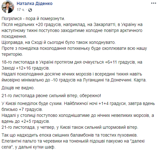 "Так что приходит эпоха смешных бубонов и толстых пуховиков. Элегантные пальто и ботинки на тонкой подошве пакуем на "дальние деревни", в дальние уголки шкафов", - пишет синоптик Наталья Диденко.