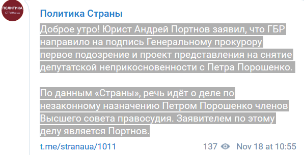 Telegram-канале "Политика Страны", в свою очередь, выяснил, по какому именно делу Петру Порошенко собираются вручать "пидозору".