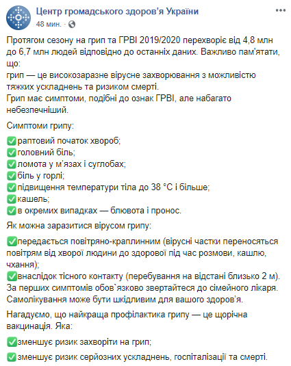 До 6,7 миллионов человек могут заболеть гриппом в эпидемическом сезоне 2019/2020 года в Украине. Об этом в Facebook на странице Центр общественного здоровья ЦОЗ сообщает Минздрав Украины.