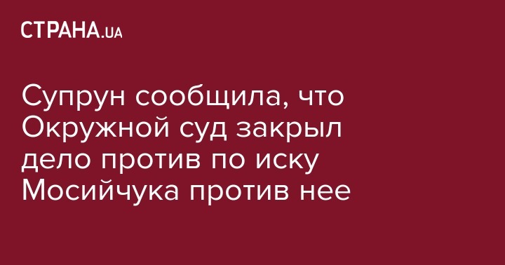 Окружной административный суд Киева закрыл дело против экс-исполняющей обязанности министра здравоохранения Украины Уляны Супрун по иску Игоря Мосийчука. Об этом Супрун написала в Twitter.