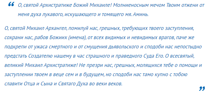 Церковные традиции: на архангела Михаила ходят в церковь, молятся о защите от всего лукавого, от дурных помыслов и злого окружения, примирении с врагами, а также об исцелении различных заболеваний.