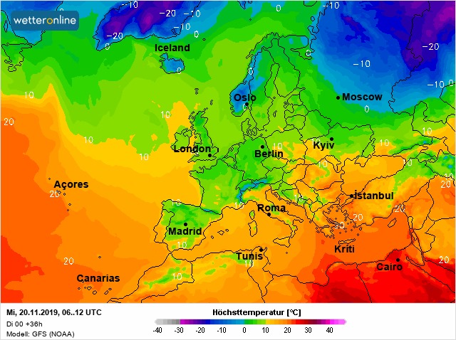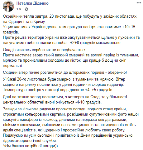 По ее словам, в среду, 20 ноября, тепло еще задержится в западных областях Украины, в Одесской области и в Крыму.