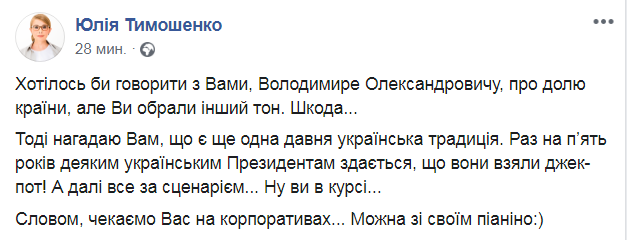 "Хотелось бы говорить с вами, Владимир Александрович, о судьбе страны, но вы выбрали другой тон. Жаль... Тогда напомню вам, что есть еще одна давняя украинская традиция. Раз в пять лет некоторым украинским президентам кажется, что они взяли джек-пот! А дальше все по сценарию... Ну вы в курсе... Словом, ждем вас на корпоративах... Можно со своим пианино", - написала Тимошенко.