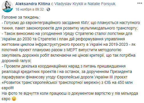 На Facebook у Клитиной различные публикации на тему работы и личной жизни. Так, на одном из фото она хвалится счастьем "работать с документами, стоимостью в полмиллиарда евро".