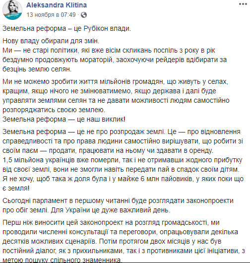 По всей видимости себя Клитина смело причисляет к новой власти. И пишет на темы земельной реформы, которую называет "Рубиконом власти".