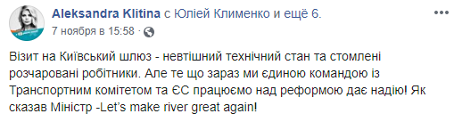 А вот ее визит как специалиста на Киевский шлюз, у которого "неутешительное техническое состояние". Впрочем, на лицах рабочих и команды транспортного комитетом и представителей ЕС разочарования не видно.