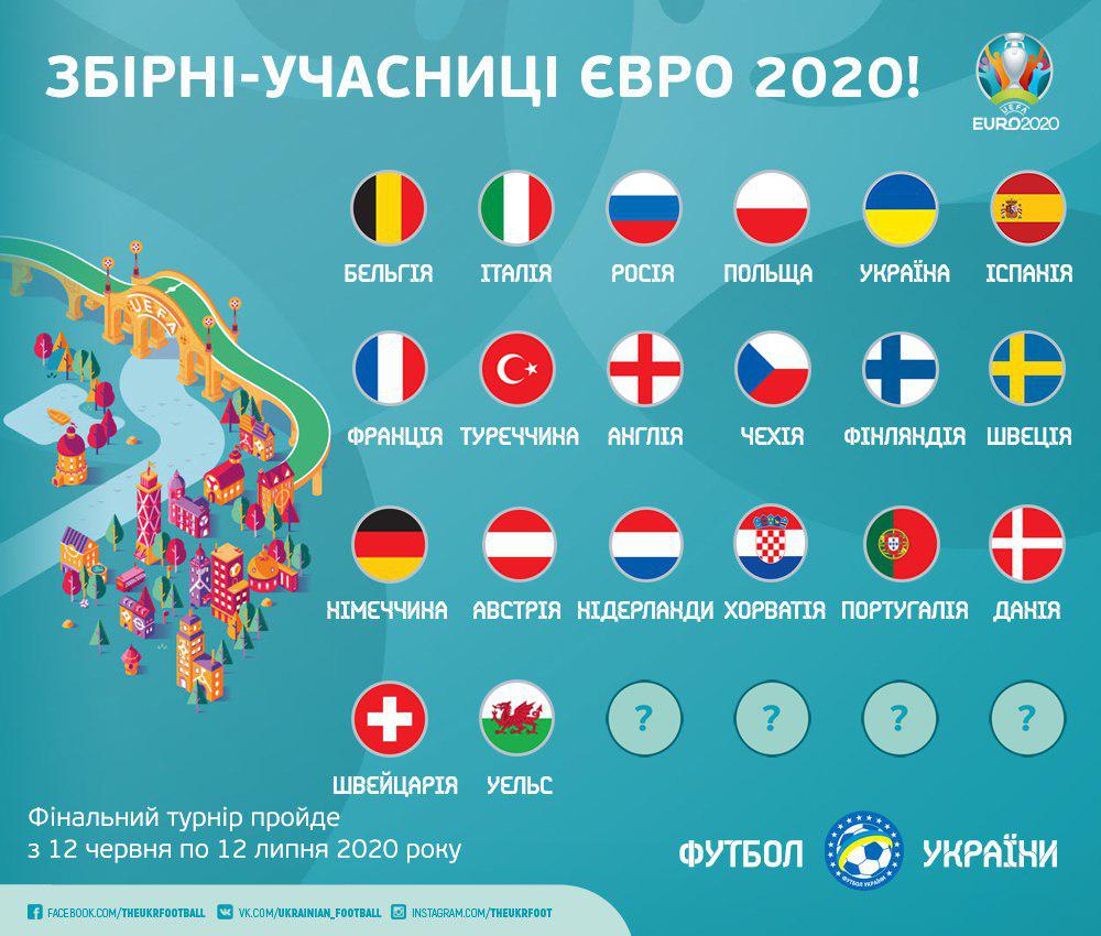 Вчера, 19 ноября, завершился групповой турнир отбора на Евро-2020 по итогам которого определились 20 команд вышедших на чемпионат Европы по футболу. Вот их перечень: Бельгия, Италия, Россия, Польша, Украина, Испания, Франция, Турция, Англия, Чехия, Финляндия, Швеция, Хорватия, Австрия, Нидерланды, Германия, Португалия, Швейцария, Дания и Уэльс.