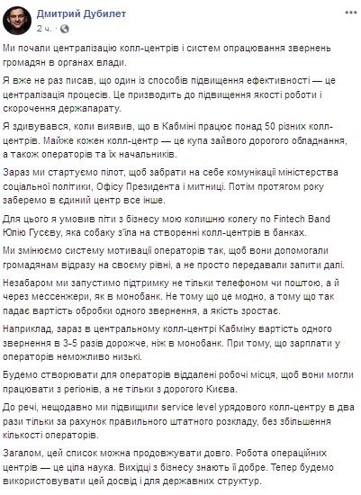 "Сейчас мы начинаем пилот, чтобы забрать на себя коммуникации министерства социальной политики, Офиса Президента и таможни. Затем в течение года заберем в единый центр всё остальное. Для этого я уговорил уйти из бизнеса мою бывшую коллегу по Fintech Band Юлию Гусеву, которая собаку съела на создании колл-центров в банках", - сказал он.
