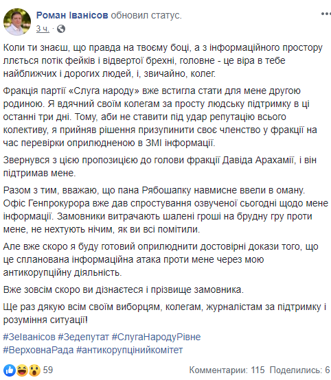 "Вместе с тем, считаю, что Рябошапку умышленно ввели в заблуждение. <...> Заказчики тратят бешеные деньги на грязную игру против меня, не пренебрегают ничем, как вы все заметили", - написал Иванисов.
