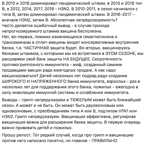 Волянский уверен: "Грипп непредсказуем и тяжелым может быть ближайший сезон. А может и не быть. Он может быть двухволновым или одноволновым, с преобладанием типа А или В, подтипом H1N1 или H3N2. Грипп непредсказуем. Вакцинация эффективна, регулярная вакцинация важна для расширения банка защиты. В первую очередь важно прививать детей и пожилых", - подытожил врач.