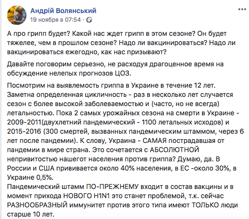 Полянский рассказал, что раз в несколько лет в Украине случается сезон с более высокой заболеваемостью и (часто, но не всегда) летальностью. К таким периодам он относит 2009-2011 годы (1100 летальных исходов) и 2015-2016 (300 смертей, вызванных пандемическим штаммом).