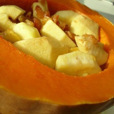 На десерт приготовим фаршированную тыкву. Для этого понадобится тыква на 1 кг. Ее нужно помыть, срезать с нее верхушку и удалить часть мякоти, не нарушая стенок. Затем берем 250 грамм груш и яблок. Нарезаем фрукты соломкой, добавляем 100 гр алычи. Мякоть очищаем от семечек, нарезаем и смешиваем с другими фруктами. Добавляем немного корицы, меда, мюслей и изюма в качестве начинки (можно использовать чернослив, курагу, гранолу). Накрываем сверху верхушкой и запекаем в духовке 1,5 часа на небольшом огне.