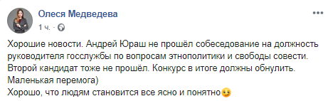 "Хорошие новости. Андрей Юраш не прошёл собеседование на должность руководителя госслужбы по вопросам этнополитики и свободы совести. Второй кандидат тоже не прошёл. Конкурс в итоге должны обнулить. Маленькая перемога. Хорошо, что людям становится все ясно и понятно", - написала Медведева.