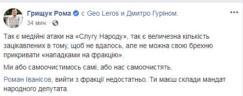 "Роман Иванисов, выйти из фракции недостаточно. Ты должен сложить мандат народного депутата", - написал Грищук в Facebook. Также он отметил, что есть много заинтересованных в медийных атаках на "Слуг народа", но "нельзя свою ложь прикрывать "нападками на фракцию", - заявил Роман Грищук.