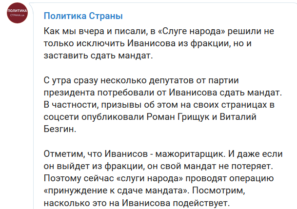 "Как мы вчера и писали, в "Слуге народа" решили не только исключить Иванисова из фракции, но и заставить сдать мандат.