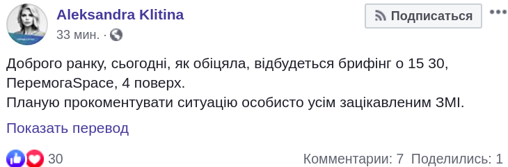 "Доброе утро, сегодня, как обещала, состоится брифинг в 15:30 ПеремогаSpace, 4 этаж. Планирую прокомментировать ситуацию лично всем заинтересованным СМИ" - написала политик.