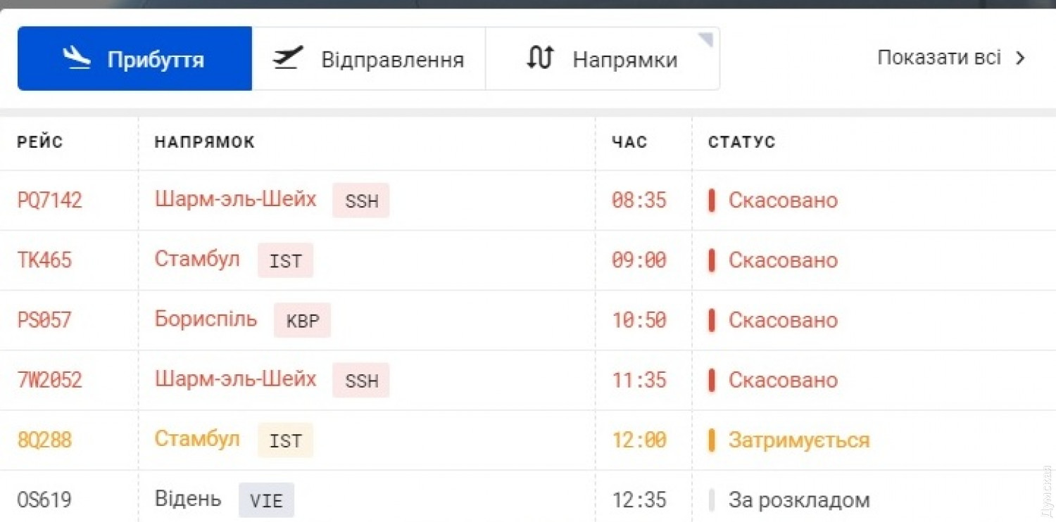 Предварительно на онлайн-табло аэропорта значится, что прибытие первого рейса состоится не раньше 12:35 - ожидается самолет из Вены авиакомпании "Austrian Airlines". Авиакомпании отправляют своих пассажиров в другие аэропорты. Например, компания SkyUp отправила людей автобусами в Херсон, а оттуда они уже полетят в Египет.