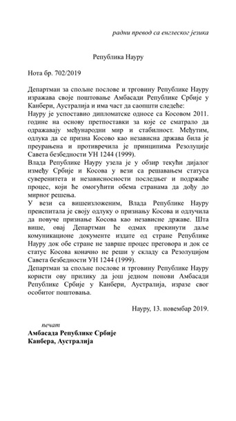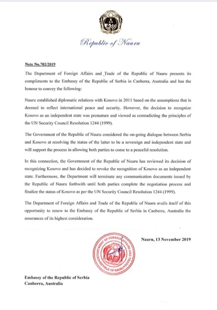 По его словам, это государство прекратит все дипломатические контакты, которые они имели с Косово до сих пор. Он сообщил, что в ноте, переданной ему заместителем министра иностранных дел Науру, говорится, что Республика Науру пришла к выводу о том, что решение о признании Косово является преждевременным и противоречит принципам резолюции №1244 Совбеза ООН.