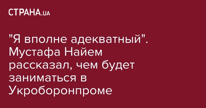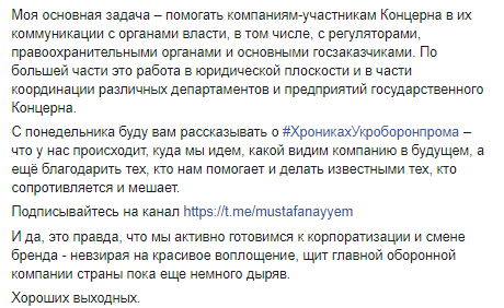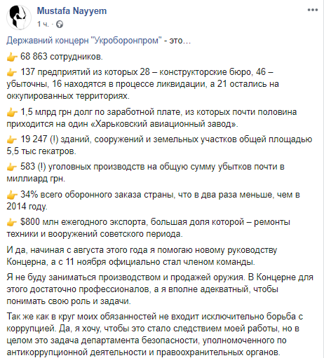 Экс-нардеп Мустафа Найем, который был назначен на должность заместителя генерального директора государственного концерна "Укроборонпром", рассказал, чем будет заниматься на новом посту. Об этом он сообщил на своей странице в Facebook.