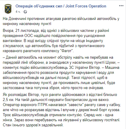 "21 ноября, от одной из воинских частей в районе проведения ООС поступило сообщение о повреждении грузовика. В ходе выезда следственной группы на место инцидента выяснилось, что автомобиль был подбит из противотанкового управляемого ракетного комплекса "Фагот", — указано в сообщении штаба.