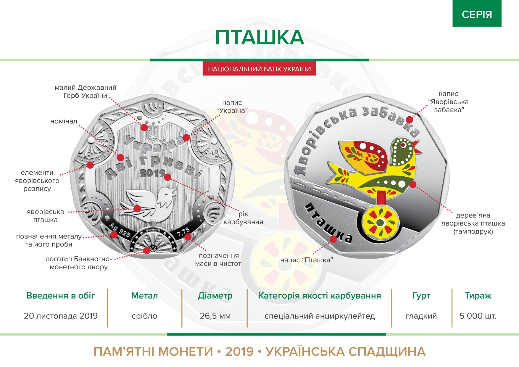 Вторая монета – "Птица". Единственное, что отличает ее от предыдущей, так это изображение цветной птицы на аверсе с надписью ЯВОРІВСЬКА ЗАБАВКА, ПТАШКА и изображение подобной птицы на реверсе.