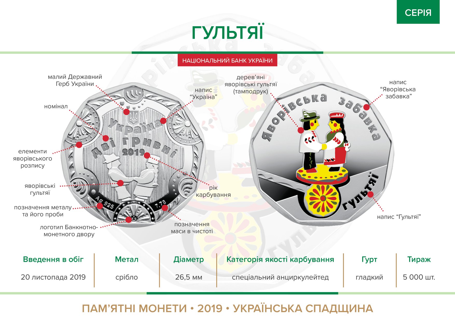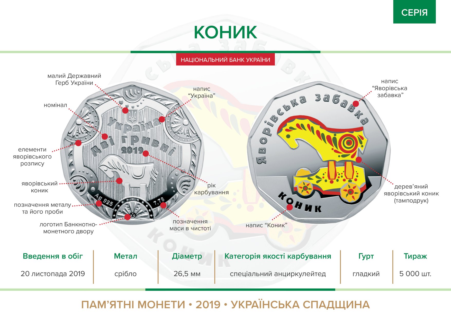 Первая монета – "Конек". На аверсе размещены малый герб Украины, под которым надписи УКРАЇНА/ДВІ ГРИВНІ/2019, изображение яворивского конька. Внизу надписи – Ag 925 (слева обозначение металла, его пробы), 7,78 (справа, обозначение массы в чистоте) и логотип Банкнотно-монетного двора Нацбанка. На реверсе монеты на зеркальном фоне размещено цветное изображение деревянного яворивского конька и надписи: ЯВОРІВСЬКА ЗАБАВКА, КОНИК.