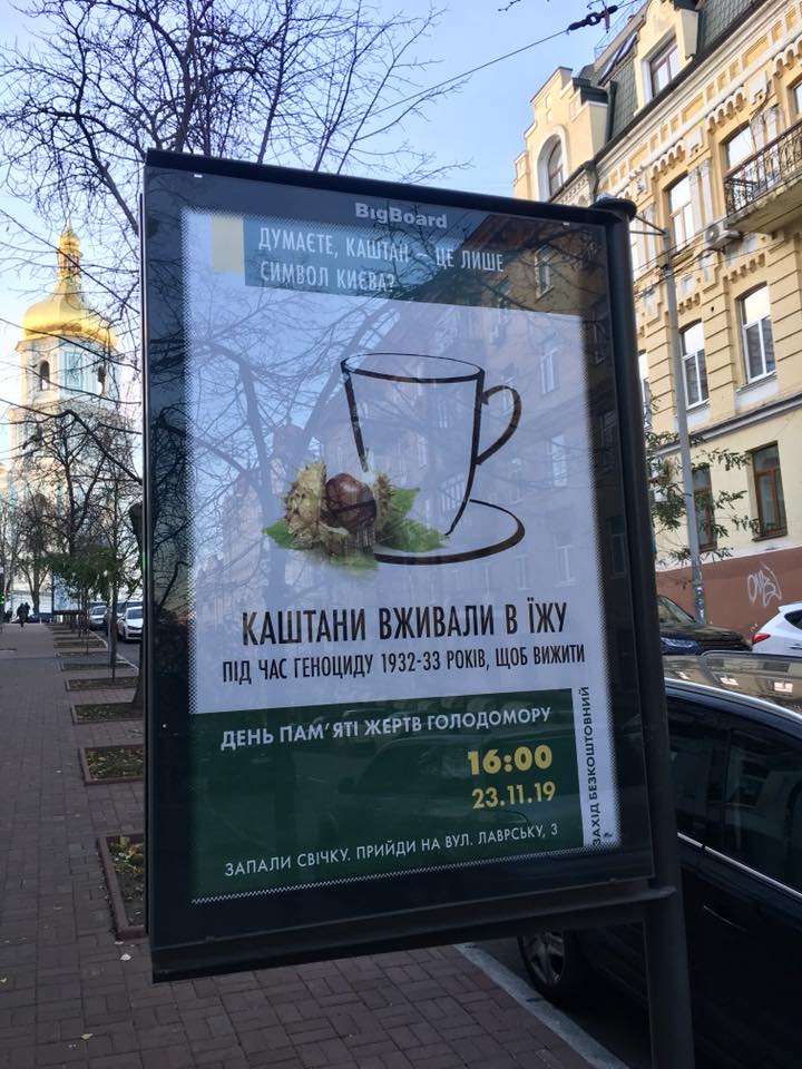 В Киеве появились билборды с каштаном и чашкой кофе, которые призывают почтить память жертв голодомора 1932-1933 годов.