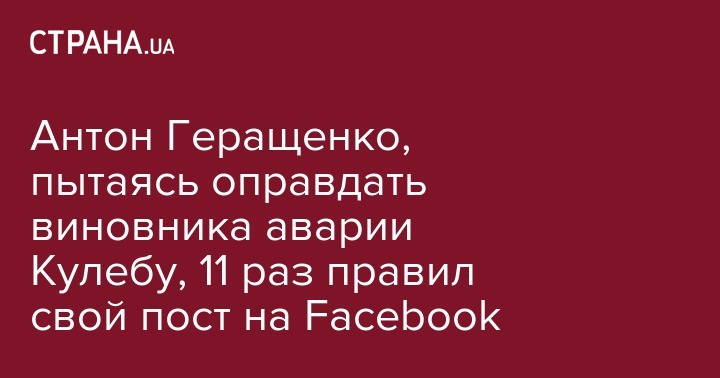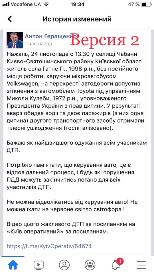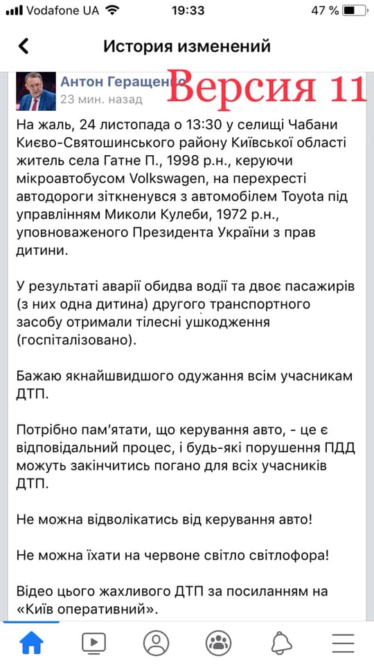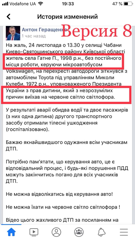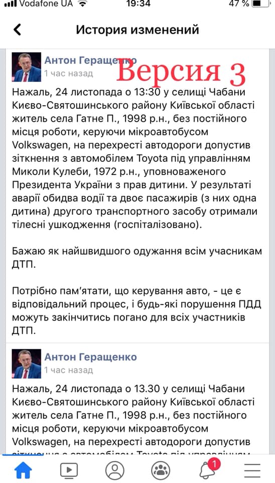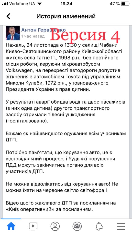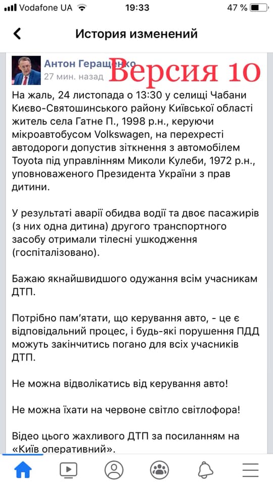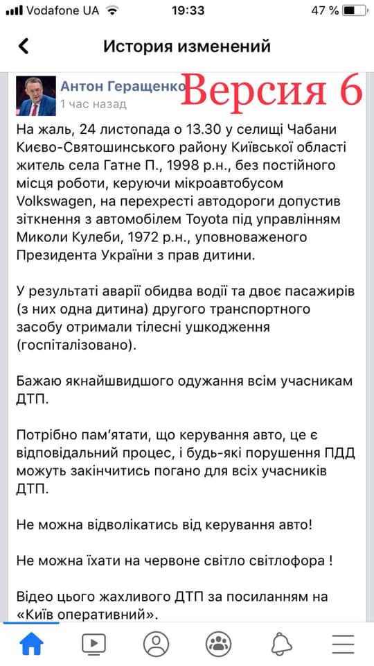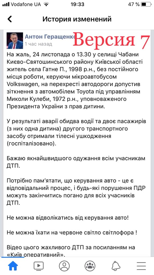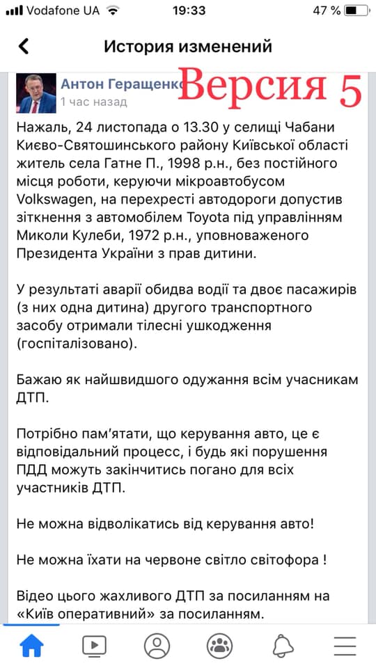 Антон Геращенко- заместитель министра внутренних дел Украины, в своем посте относительно аварии детского омбудсмена Николая Кулебы, который выехал на перекрестке на красный, сделал 11 правок, пытаясь "оправдать" действия чиновника.