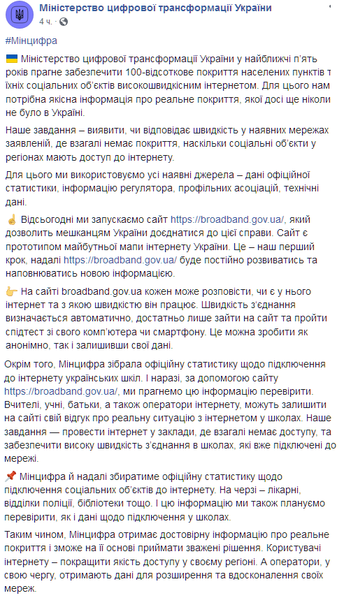 "Для этого нам нужна качественная информация о реальном покрытии, которой до сих пор еще никогда не было в Украине. Наша задача - выявить, соответствует ли скорость в существующих сетях заявленной, где вообще нет покрытия, как социальные объекты в регионах имеют доступ к интернету. Для этого мы используем все имеющиеся источники - данные официальной статистики, информацию регулятора, профильных ассоциаций, технические данные", - говорится в сообщении.