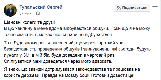 Тупальский не написал, в связи с чем к нему пришли с обысками правоохранители. Но уверенно заявил, что их действия беспочвенны.