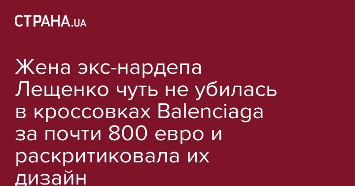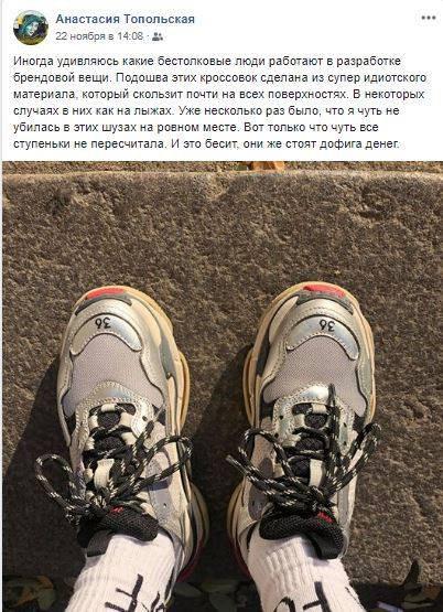 Жена экс-нардепа Сергея Лещенко  ди-джей Анастасия Топольская пожаловалась на неудобство брендовых кроссовок Balenciaga Triple S sneakers, которые стоят около 800 евро. Обувь она поругала на своей странице в Facebook.