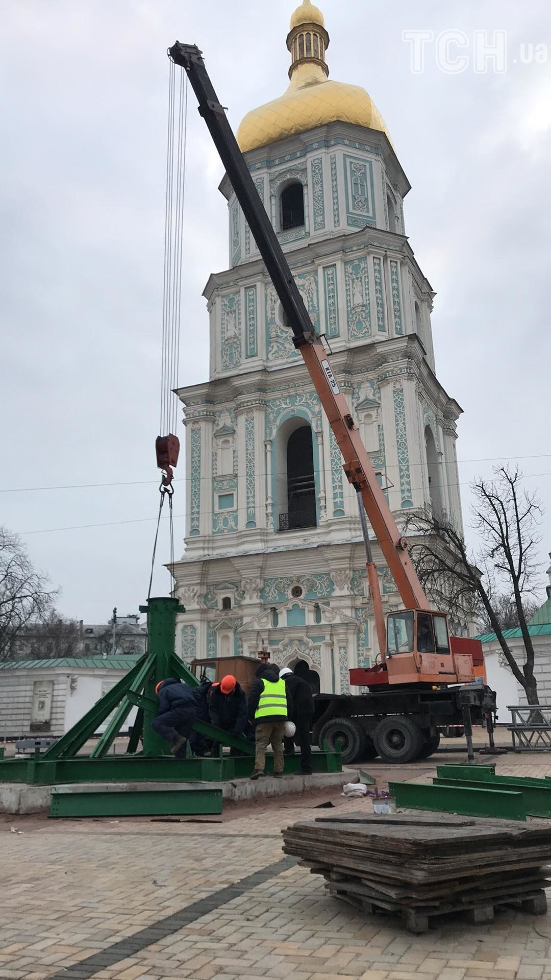На Софийской площади в Киеве начали монтировать главную елку Украины. Фото