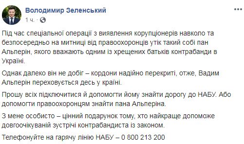 О том, что Альперин якобы исчез во время специальной операции на таможне сообщил сам Зеленский.