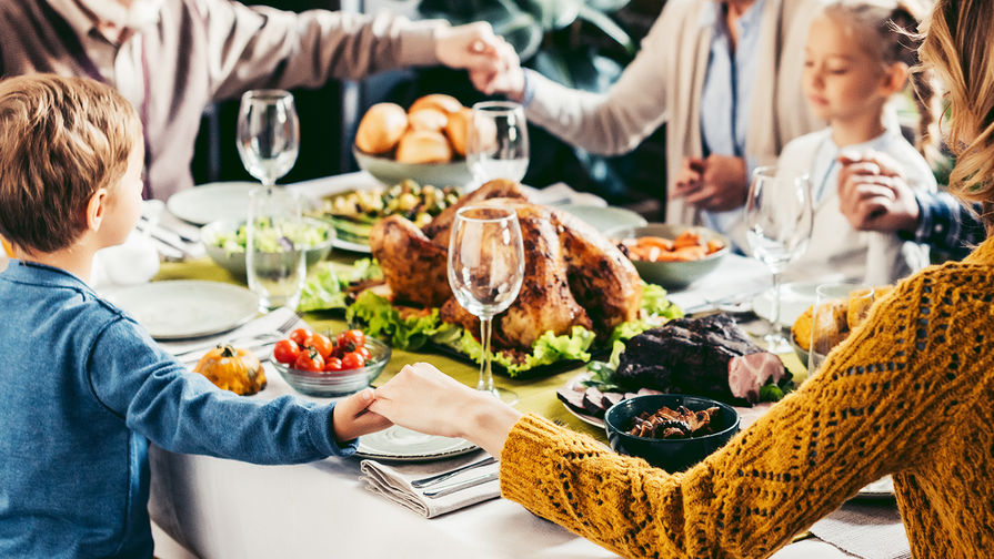 День благодарения принято встречать вместе с семьей. Американцы стараются так распланировать свое время и путешествия, чтобы добраться домой, и успеть накрыть богатый стол с традиционными блюдами: фаршированной индейкой под клюквенным сиропом, сладким картофелем, тыквенным пирогом с подливкой, а еще початками кукурузы, яблоками и апельсинами, орехами и виноградом. Именно такие блюда ели предки американцев в XVII веке. А вот в Канаде кулинарные пристрастия немного иные: жители готовят шарлотку и пельмени с мясом индейки.