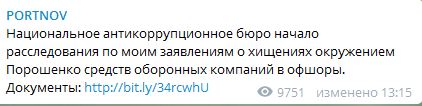 Национальное антикоррупционное бюро (НАБУ) начало расследование по заявлениям юриста Андрея Портнова о хищениях окружением экс-президента Петра Порошенко средств оборонных компаний в офшоры. Об этом Портнов написал в Telegram.