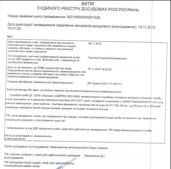 Портнов также опубликовал выписки из Единого реестра досудебных расследований, из которых следует, что уголовные производства открыты по ст. 191 ч. 5 (Присвоение, растрата имущества или овладение им путем злоупотребления служебным положением), ст. 204 ч. 3 (Незаконное изготовление, хранение, сбыт или транспортировка с целью сбыта подакцизных товаров) и ст. 364 ч. 2 (Злоупотребление властью или служебным положением) Уголовного кодекса Украины.