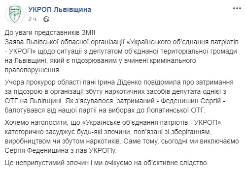 "Сергей Феденишин баллотировался от нашей партии на выборах в Лопатинскую ОТО. Хотим подчеркнуть, что "Украинское объединение патриотов – УКРОП" категорически осуждает любые преступления. Мы исключаем Сергея Феденишина из рядов УКРОПа", – сообщили на официальной странице организации в фейсбуке.