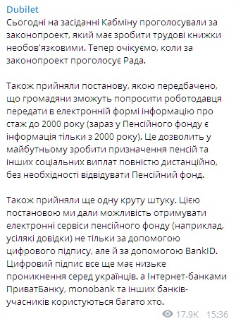 Кабинет министров Украины одобрил закон о переводе трудовых книжек граждан в цифровой формат. Об этом сообщил министр Кабинета министров Дмитрий Дубилет в Telegram.