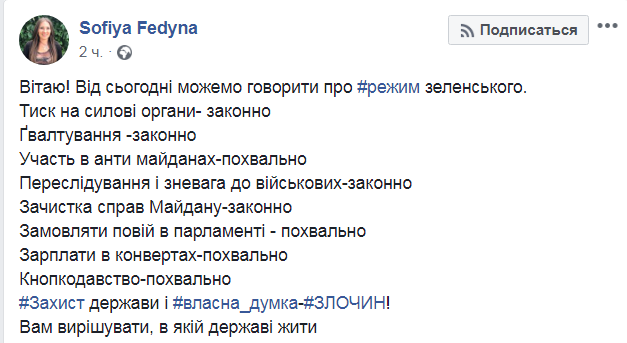 Так же сама София Федына, народный депутат от партии Петра Порошенко "Европейская солидарность" расценила подготовку ей подозрения как свидетельство существования режима Зеленского. Об этом нардеп написала в своем Facebook.