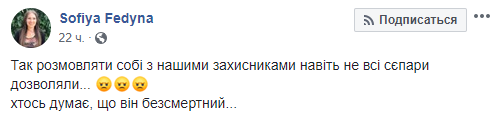 Вслед за видеозаявлениями Федына размещала и посты негодования политикой Зеленского у себя в Facebook. Они также сопровождены заявлениями об убийстве: "кто-то думает, что он бессмертный".
