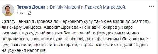 "Жалобу Геннадия Дронова в Верховный суд также не взяли к рассмотрению, как и жалобу Зайцевой", - написала журналистка.