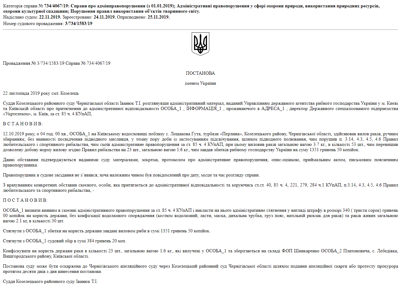 "Признать виновным в совершении административного правонарушения по ст. 85 ч. 4 КоАП и назначить ему наказание в виде штрафа в размере 340 (триста сорок) гривен 00 копеек в пользу государства, без конфискации водолазного снаряжения... и раков живых общим весом 2,1 кг, в количестве 30 шт", - говорится в сообщении.