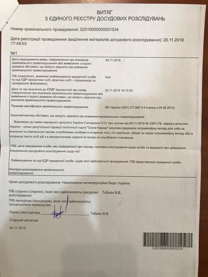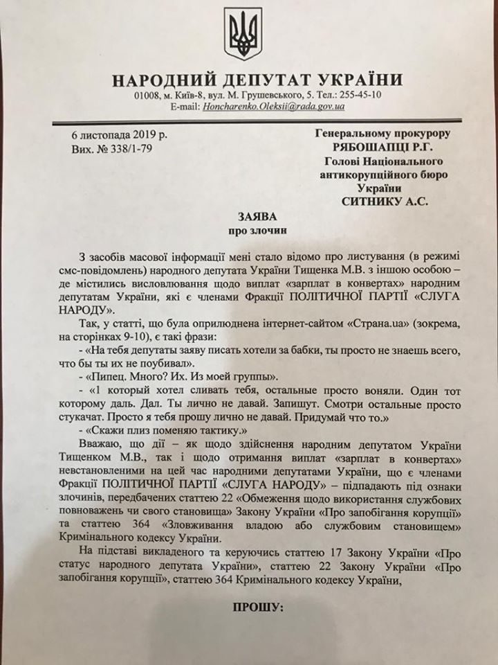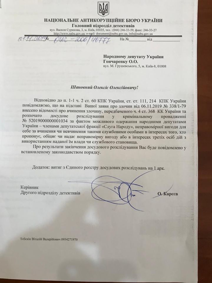 "Национальное антикоррупционное бюро расследует ситуацию с зарплатами в конвертах для "Слуг народа", которые раздавал Николай Тищенко. В ответе на мое заявление указано, что открыто уголовное производство по части 4 статьи 368 Уголовного кодекса Украины по факту возможного незаконного получение членами фракции "Слуга народа" неправомерной выгоды, другими словами – взятки", - говорится в сообщении.