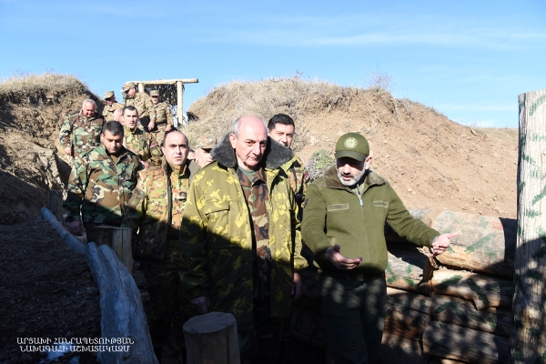 Президента и премьер-министра сопровождали начальник Генштаба вооруженных сил Армении Артак Давтян и министр обороны Нагорного Карабаха Карен Абрамян.
